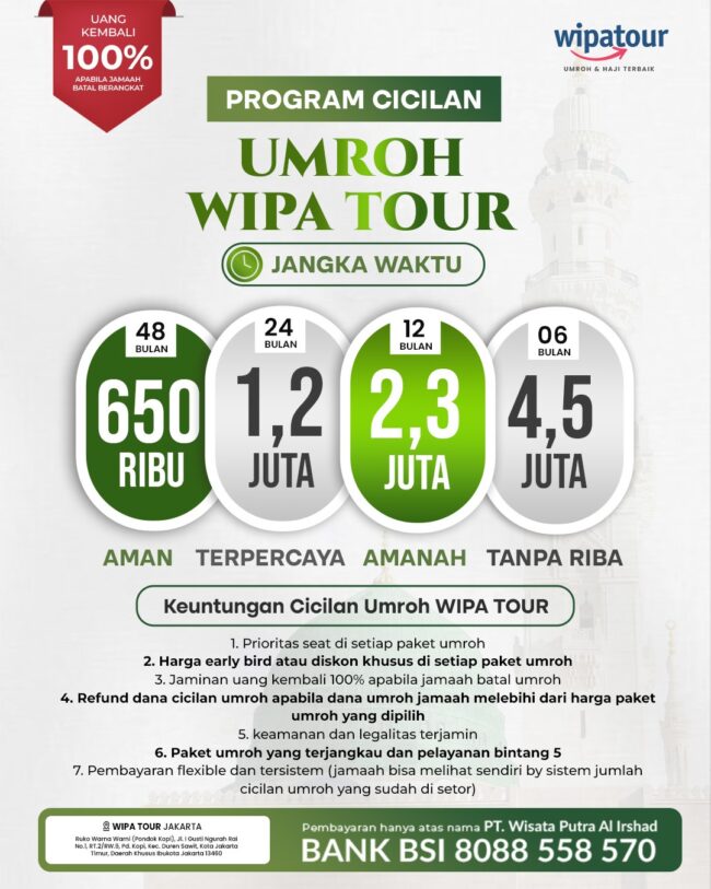 Bagi banyak umat Muslim, menunaikan ibadah umroh adalah cita-cita mulia yang sering kali terkendala oleh kesiapan biaya yang cukup besar jika harus dibayarkan sekaligus. Memahami kerinduan tersebut, WIPA TOUR menghadirkan solusi inovatif melalui Program Tabungan Umroh. Program ini dirancang khusus untuk memfasilitasi Anda agar dapat menabung secara bertahap demi menjemput panggilan Allah ke Baitullah.