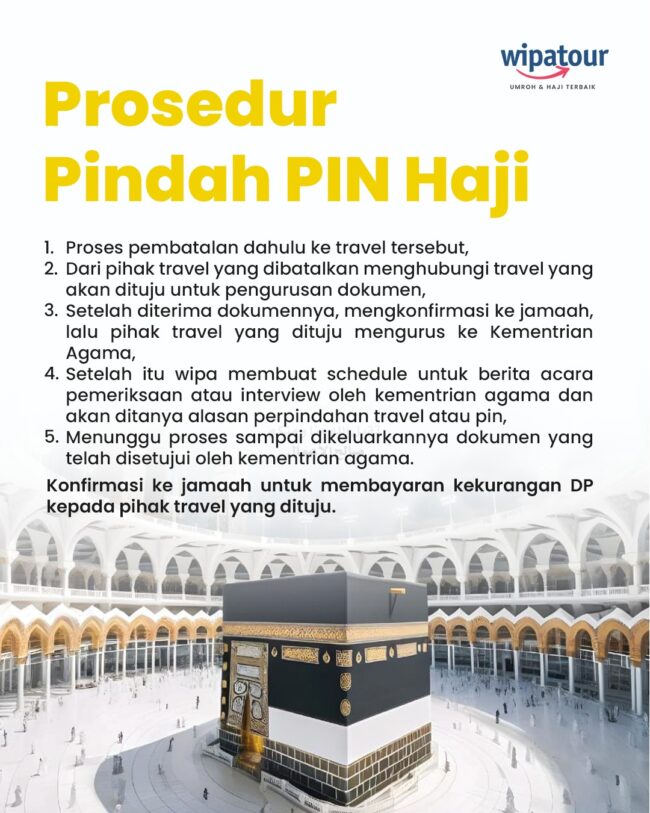 Bagi Anda yang sudah memiliki nomor porsi haji namun ingin berpindah bimbingan ke Wipa Tour agar dapat berangkat bersama Ustadz Maududi Abdullah dan Ustadz Abdullah Taslim, kami menyediakan layanan Pindah PIN Haji.