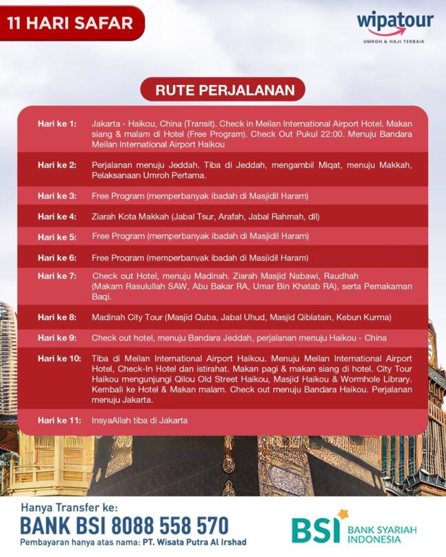 Paket Umrah Plus China bersama Wipa Tour adalah jawaban bagi Anda yang mencari keseimbangan antara ibadah wajib dan wisata religi yang bermakna. Dengan harga mulai dari 23 jutaan, fasilitas hotel bintang 4, dan maskapai Hainan Air, perjalanan ini menawarkan value for money yang sangat tinggi.